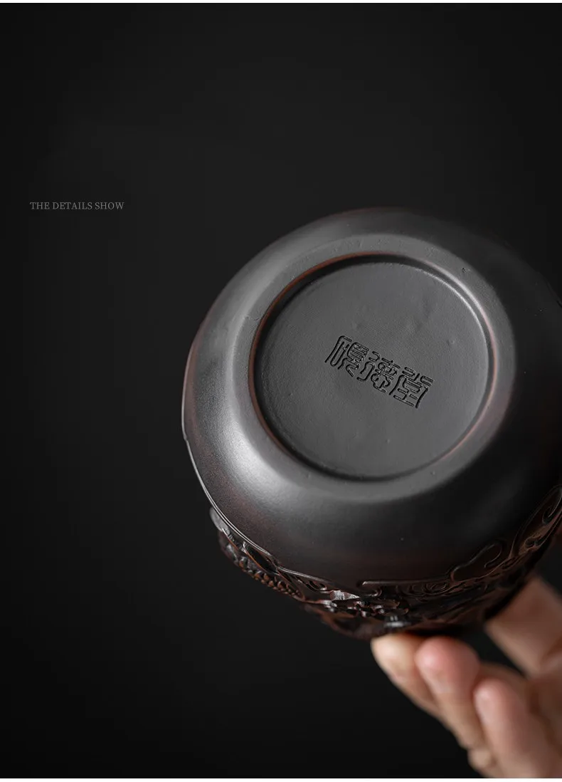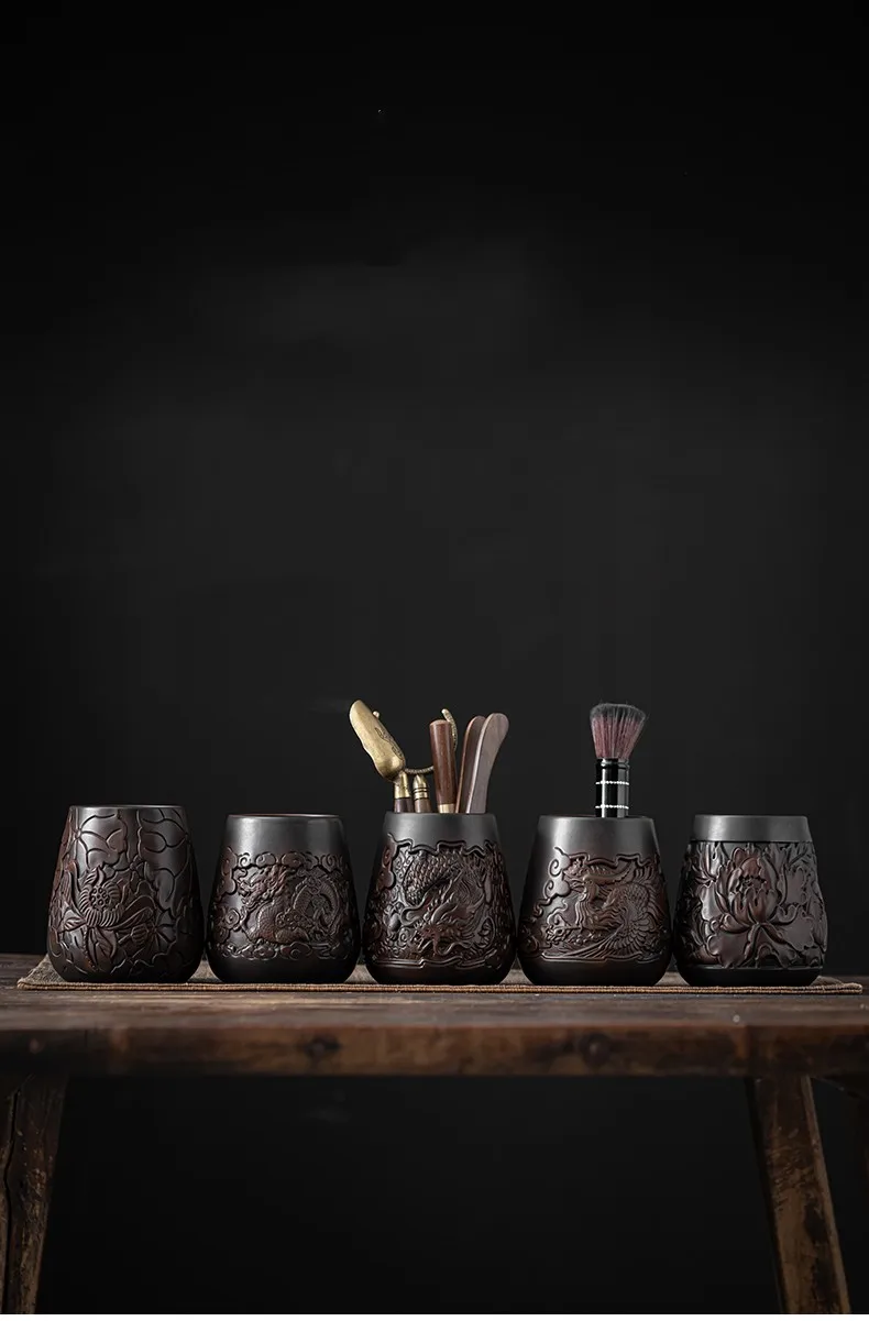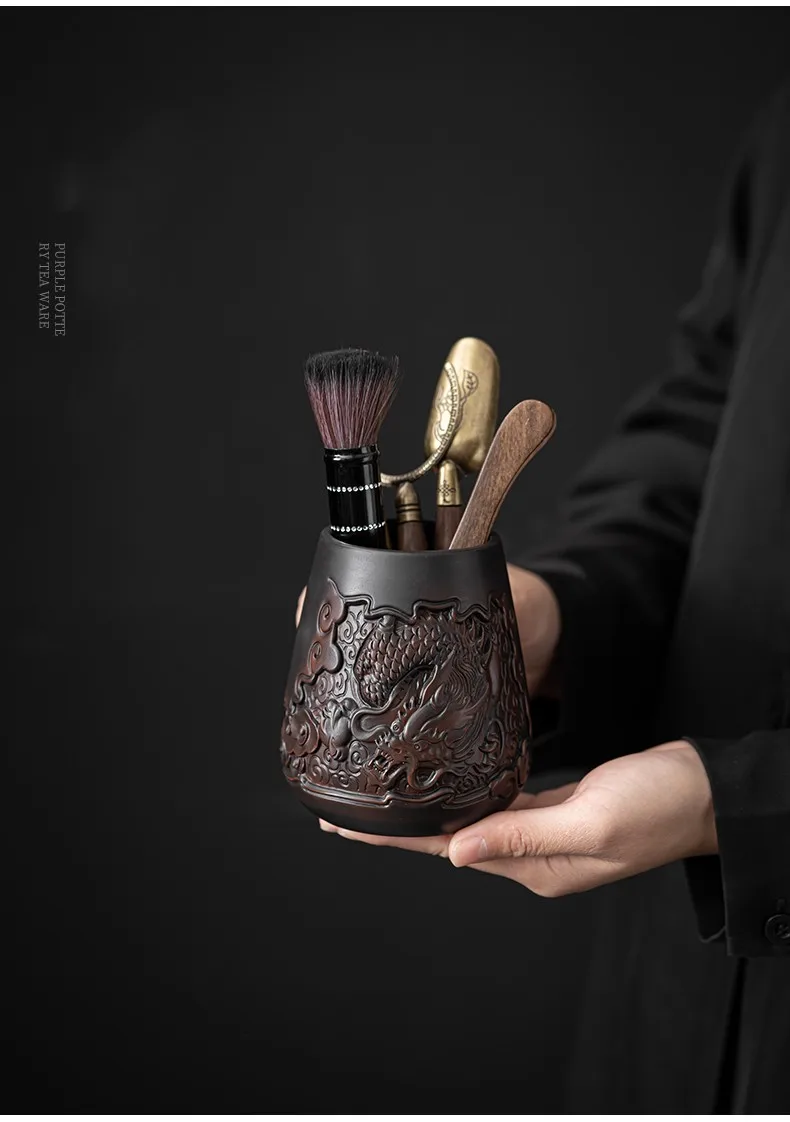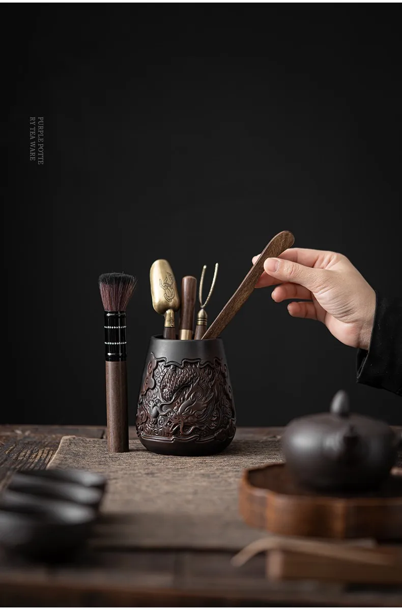 High-End Purple Pottery Tea Ceremony Six Gentlemen Hand Carving Pottery Blackwood Solid Kung Fu Tea Set Accessorie